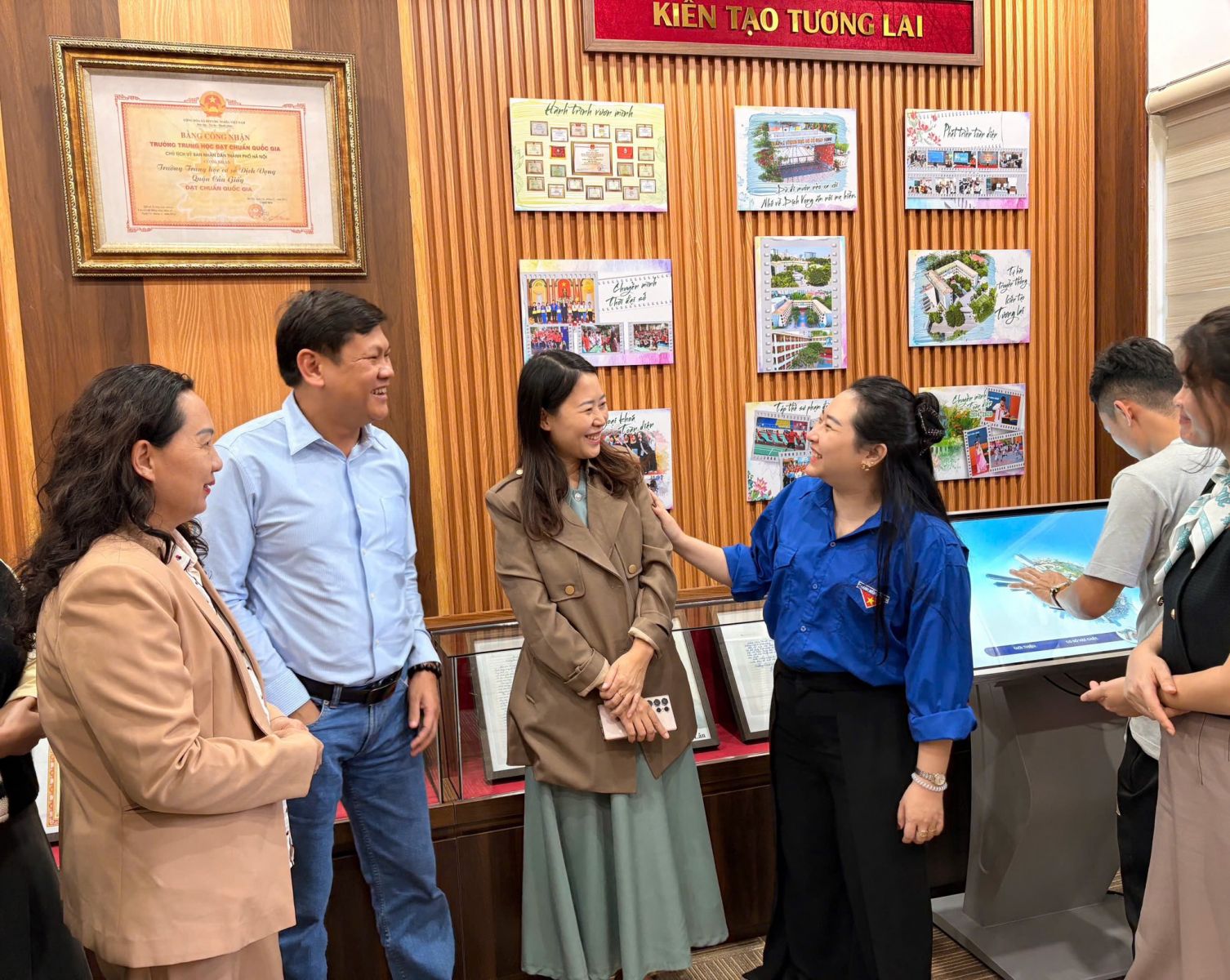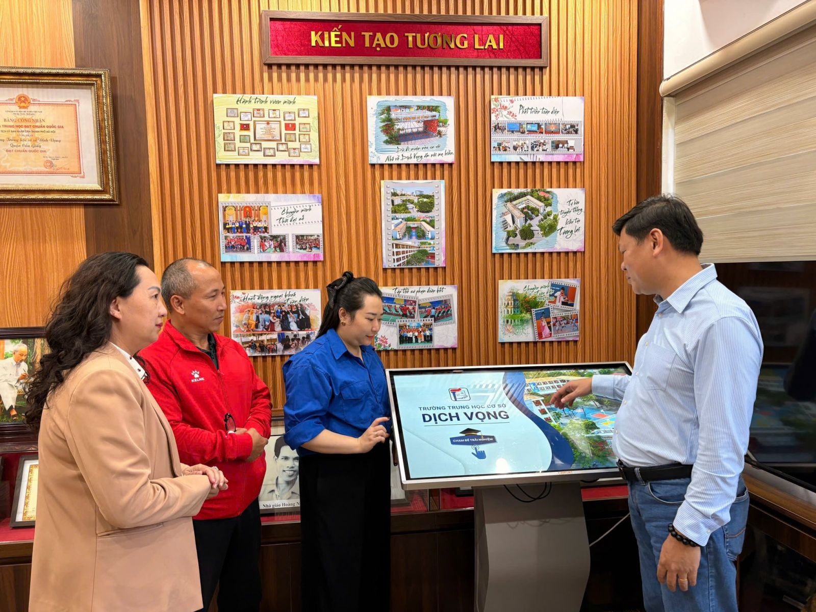 Máy KIOSK cảm ứng được đặt tại phòng truyền thống nhà trường, nhằm giúp cho công tác trưng bày, tra cứu tư liệu và giới thiệu lịch sử phát triển của trường trở nên sinh động, thuận tiện và hiện đại hơn. Thiết bị cho phép học sinh, giáo viên và khách tham quan dễ dàng tiếp cận các tư liệu quý: hình ảnh, video, các mốc son đáng nhớ, thành tích nổi bật qua từng thời kỳ. Ngoài ra, người xem có thể nhìn một cách rõ nét toàn cảnh trường, 360 độ các phòng, cơ sở vật chất phòng chức năng, khu hành chính, thư viện và các hạng mục cơ sở vật chất thông qua hình ảnh và video được tích hợp trong máy.